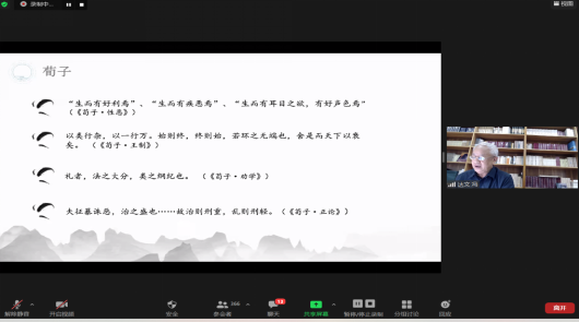 2021年11月2日晚,伟德bv国际体育“中国文化”系列高端讲座第九讲暨同济高等讲堂第42讲通过远程视频会议成功举办。中山大学哲学系冯达文教授应邀作了题为“回归生活世界的价值诉求——儒学变迁史略说”的讲座。讲座由bevictor伟德陈畅老师主持,来自伟德bv国际体育各公司三百余名师生全程参与聆听了本次讲座。