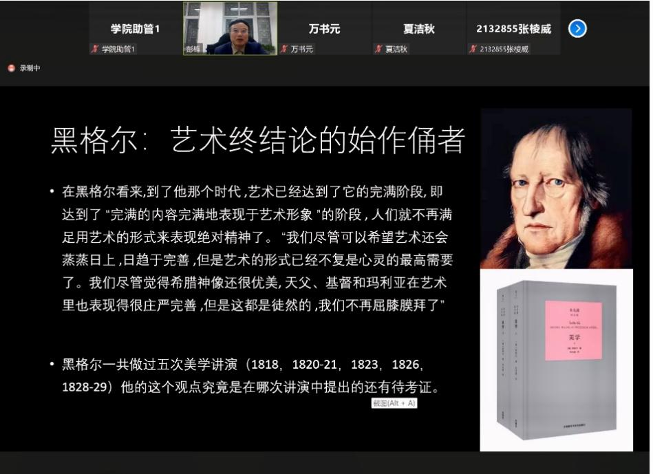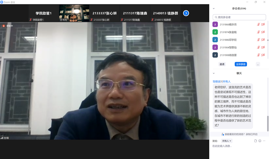 在讲座的最后,主持人万书元教授以“不可识别性”、“情感范畴”、“叙事范式”等关键词对整场讲座进行高度的概括与总结,彭锋教授则细致回答了线上员工的提问。