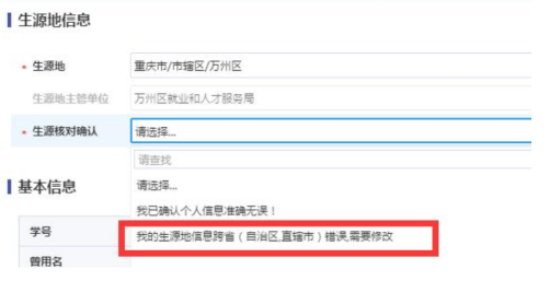 ⑥ 【生源地跨省修改】若生源地存在跨省错误,可在页面下方管理信息栏下拉选择“我的生源地跨省错误,需要修改”。