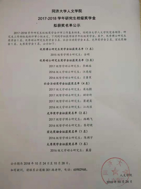 2017-2018学年研究生国家奖学金拟获奖名单公示